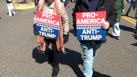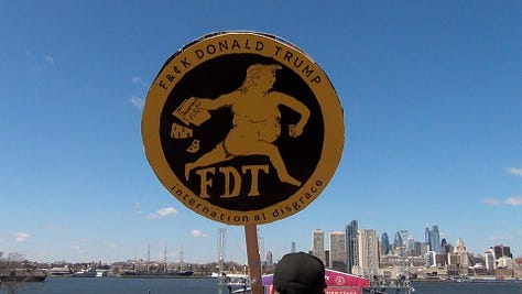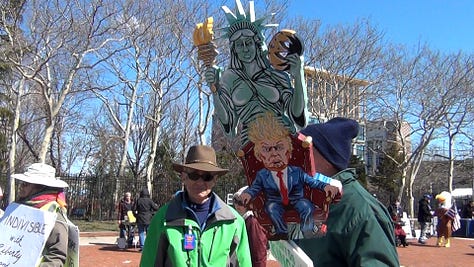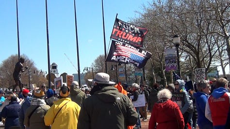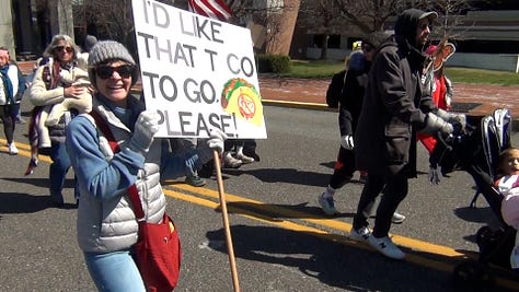 Activists mainly from the political left chanted slogans like “This is what democracy looks like!” and “Hey, hey, ho, ho, Donald Trump has got to go!” as they marched from Camden City Hall to the park under sunny but chilly March skies.